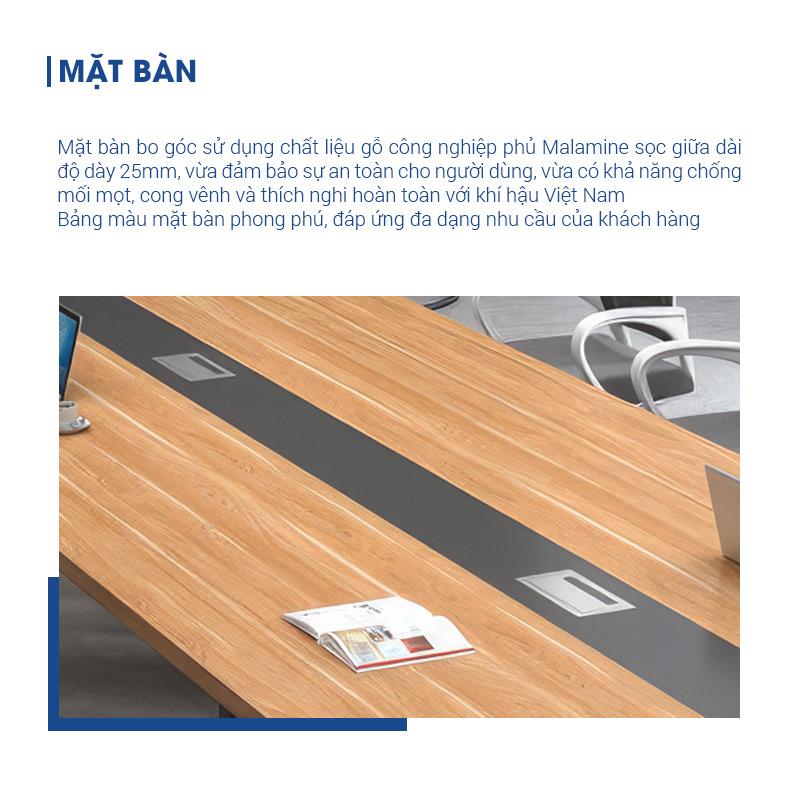| Khung bàn | Khung bàn làm từ sắt sơn tĩnh điện chống han gỉ, có độ bền cao. Ống chân có kích thước 50x50mm, giằng bàn 25x50mm tạo nên kết cấu vững chắc cho tổng thể sản phẩm. |