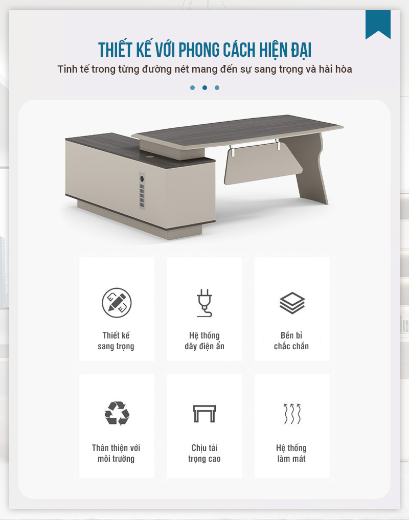 Bàn Lãnh Đạo Nhập Khẩu Ankeni AKN-B929 nổi bật với thiết kế mạnh mẽ, sang trọng, tạo cảm giác quyền lực cho không gian làm việc. Các chi tiết được hoàn thiện tinh xảo, mang phong cách hiện đại châu Âu. Sản phẩm phù hợp với các văn phòng giám đốc, quản lý cấp cao. Đây là lựa chọn lý tưởng cho những ai đề cao cả thẩm mỹ lẫn hiệu năng.