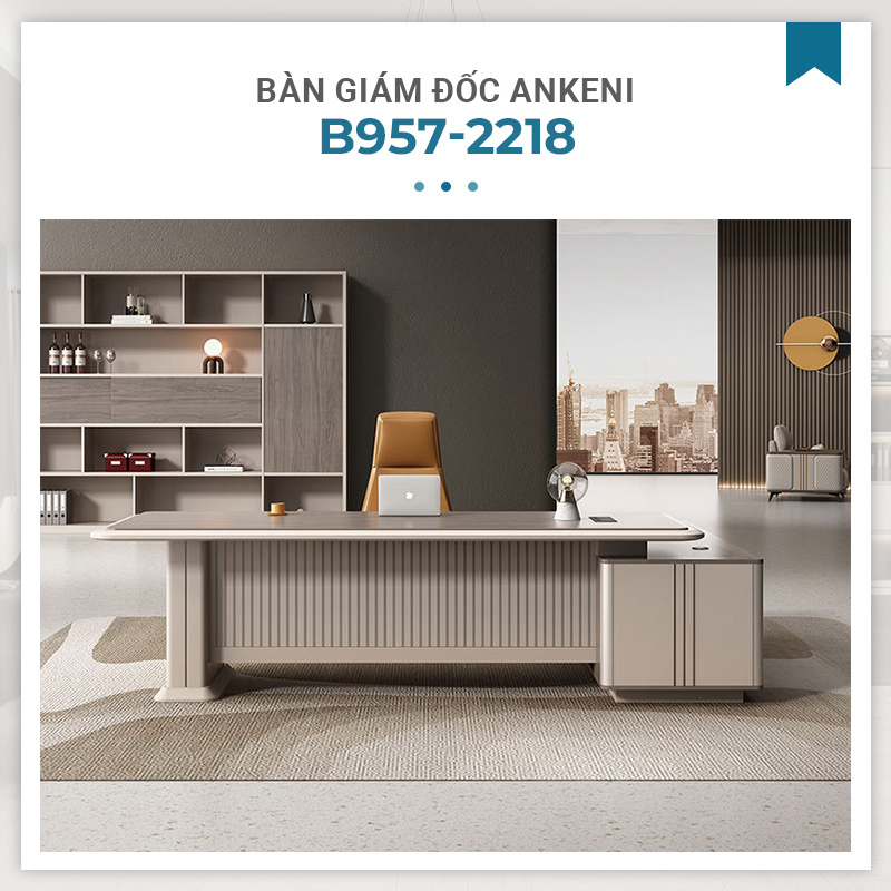 Ankeni B957-2218 thể hiện rõ uy quyền và sự độc tôn của người lãnh đạo thông qua thiết kế đặc biệt. Mặt bàn hình chữ nhật lớn được nâng đỡ bởi bộ phận tủ phụ, tạo nên kết cấu hình chữ L giúp diện tích làm việc trở nên rộng rãi, cho phép người lãnh đạo có thể thoải mái đặt nhiều loại vật dụng khác nhau như máy tính, điện thoại, máy in, bút, tài liệu,… trên bàn.