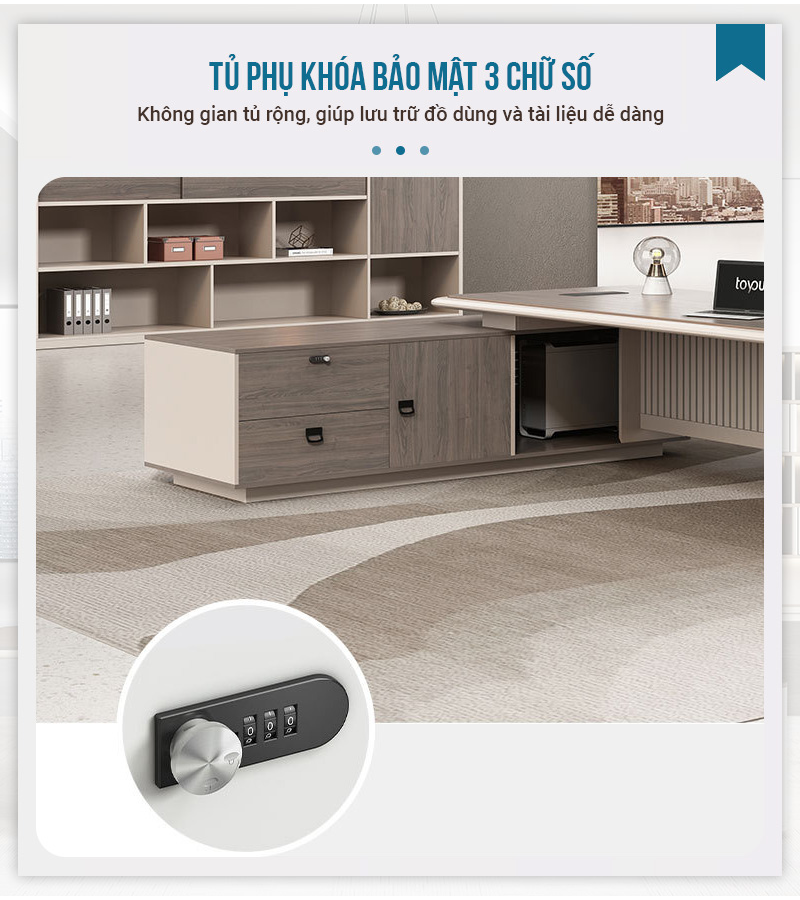 Đặc biệt, để tạo điểm nhấn công nghệ cũng như nâng cao tính năng sử dụng, tủ phụ của bàn giám đốc Ankeni B957-2218 còn được tích hợp thêm khóa mật mã 03 số, góp phần gia tăng tối đa tính bảo mật, riêng tư cho không gian làm việc của các Boss. Phần cạnh bàn cũng được đội ngũ sản xuất gia công tỉ mỉ, cắt gọt kỹ càng để mang tới sự tiện dụng, an toàn cho người dùng.