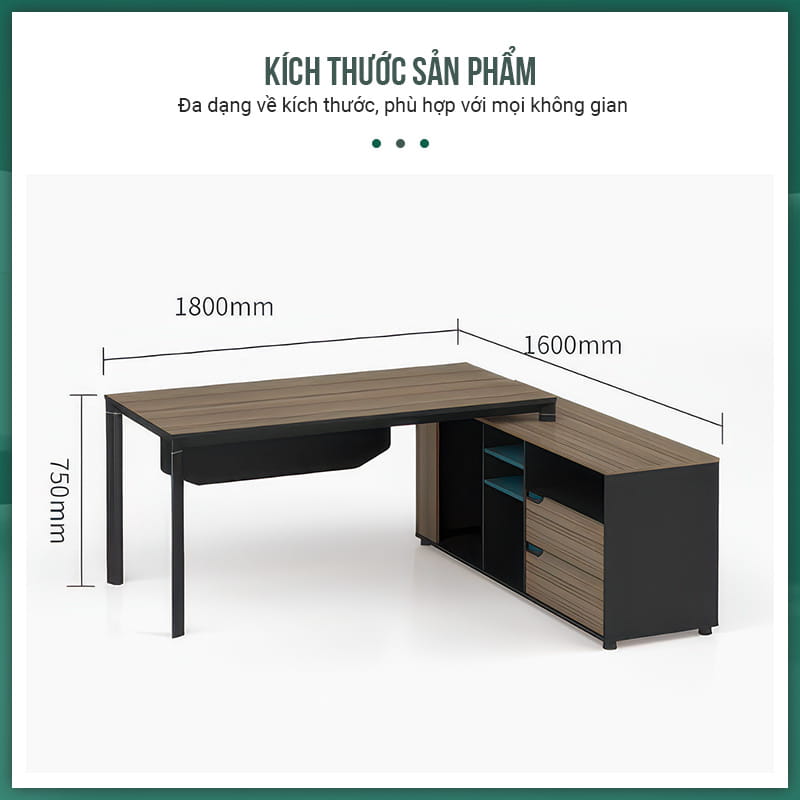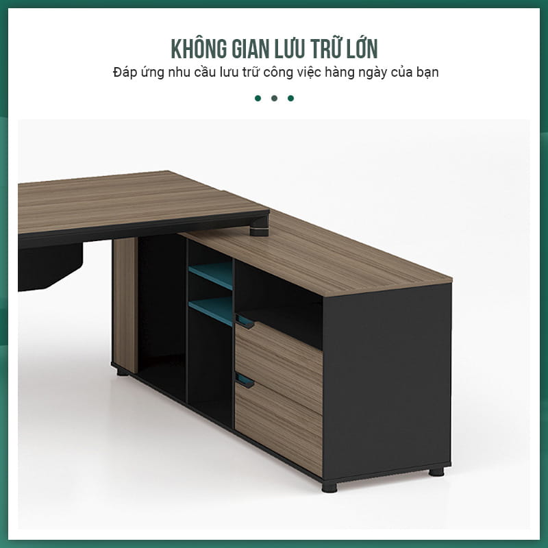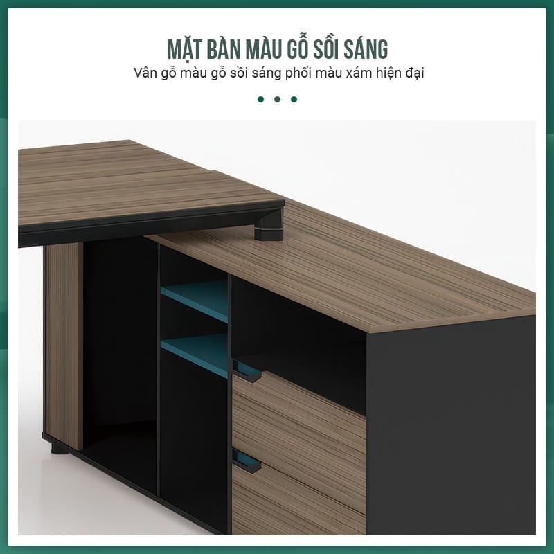 Bàn Lãnh Đạo Nhập Khẩu Lotus LT-01T1816 là mẫu bàn cao cấp nổi bật với thiết kế ấn tượng, mang đến nguồn cảm hứng và năng lượng tích cực cho không gian làm việc của người lãnh đạo. Với kích thước tiêu chuẩn 180 x 160 x 75 cm (dài – rộng – cao), sản phẩm cung cấp không gian làm việc rộng rãi, tiện nghi, phù hợp với các phòng giám đốc hiện đại. Sự phối hợp tinh tế giữa vân gỗ sồi cùng gam màu xám và xanh tạo nên tổng thể sang trọng, khác biệt, góp phần nâng tầm hình ảnh chuyên nghiệp và đẳng cấp cho doanh nghiệp. Đây là mẫu Bàn Quản Lý cao cấp được nhiều người ưa chuộng khi mua hàng tại Nội Thất VixFurnture.