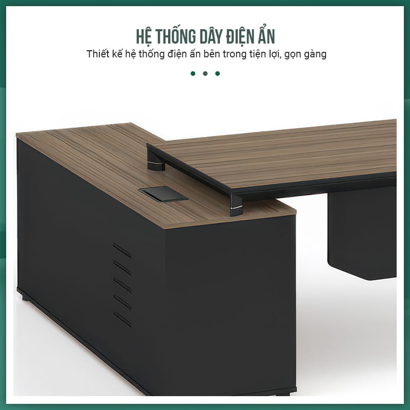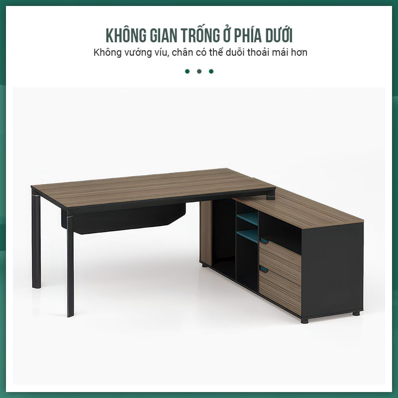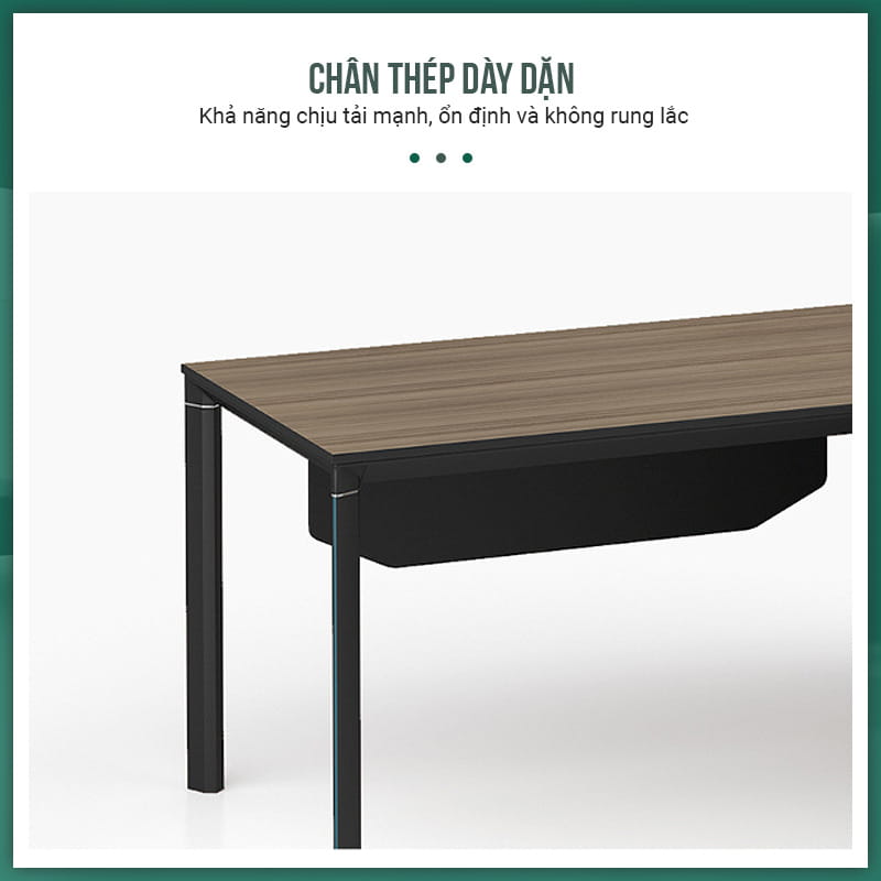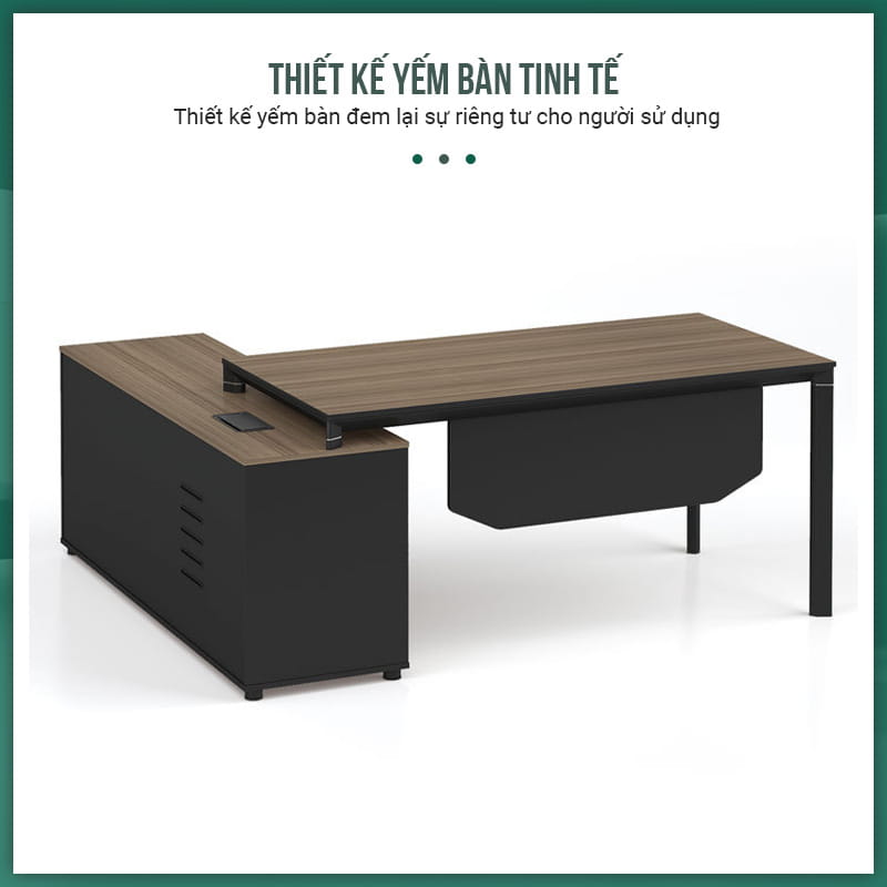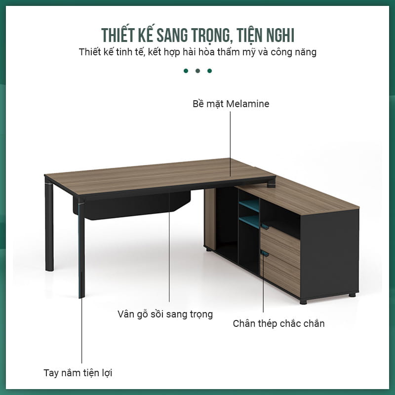 Điểm nổi bật của Bàn Lãnh Đạo Nhập Khẩu Lotus LT-01T1816 nằm ở chất liệu cao cấp và thiết kế tỉ mỉ trong từng chi tiết. Mặt bàn sử dụng ván gỗ MFC và MDF phủ Melamine đạt tiêu chuẩn E1 châu Âu, đảm bảo độ bền, hạn chế cong vênh và an toàn cho sức khỏe người dùng. Khung chân thép sơn tĩnh điện màu xám mờ kết hợp khớp nối hợp kim nhôm chắc chắn, cùng chi tiết viền xanh cách điệu tạo điểm nhấn hiện đại. Các cạnh bàn được gia công bo cong tinh tế, mang lại sự an toàn và thoải mái khi sử dụng. Ngoài ra, bàn đi kèm tủ phụ tiện lợi với ngăn chứa CPU hỗ trợ tản nhiệt tốt, giúp tối ưu không gian lưu trữ và giữ cho khu vực làm việc luôn gọn gàng, khoa học.